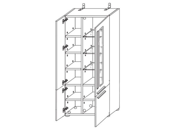 Moderns vitrīnas skapis ar grafīta skaidu plātnes korpusu (iekšpuse Artisan ozola apdarē), grafīta lamināta MDF priekšpusi ar supermatētu grafīta apdari un Artisan ozola apdares akcentiem. Skapim ir vienas stikla/koka durvis, trīs koka durvis, divi strukturāli plaukti, pieci plaukti un trīs stikla plaukti. Aprīkots ar LED apgaismojumu.